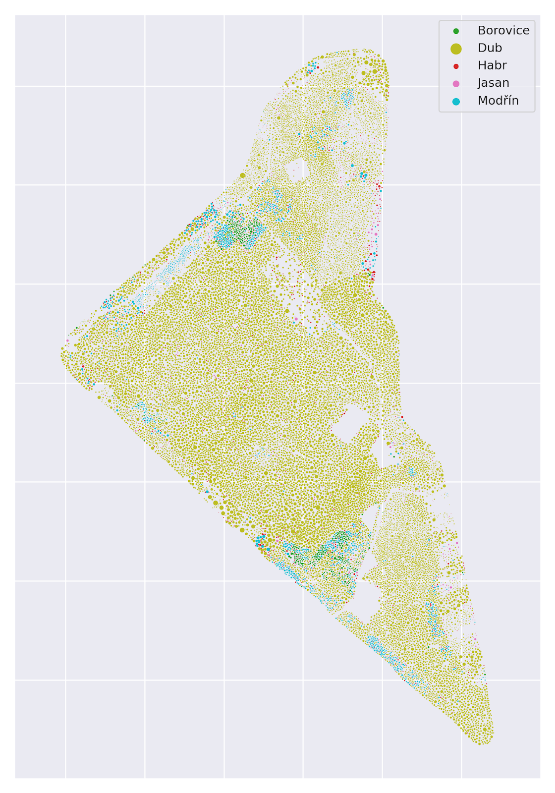 Znázornění prostorového rozložení jednotlivých dřevin. Velikost bodů odpovídá dřevní zásobě jednotlivých stromů.