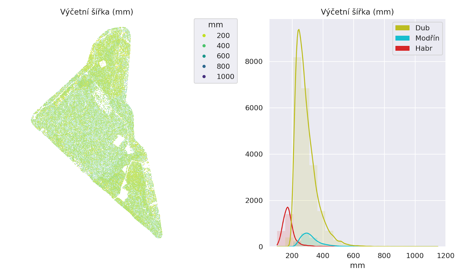 Vlevo: rozmístění stromů podle výčetní tloušťky, barevně odlišené průměry – legenda je škála začínající od 0. Vpravo: histogram rozložení výčetních tlouštěk podle jednotlivých dřevin – zobrazeny jsou tři nejpočetnější rody.