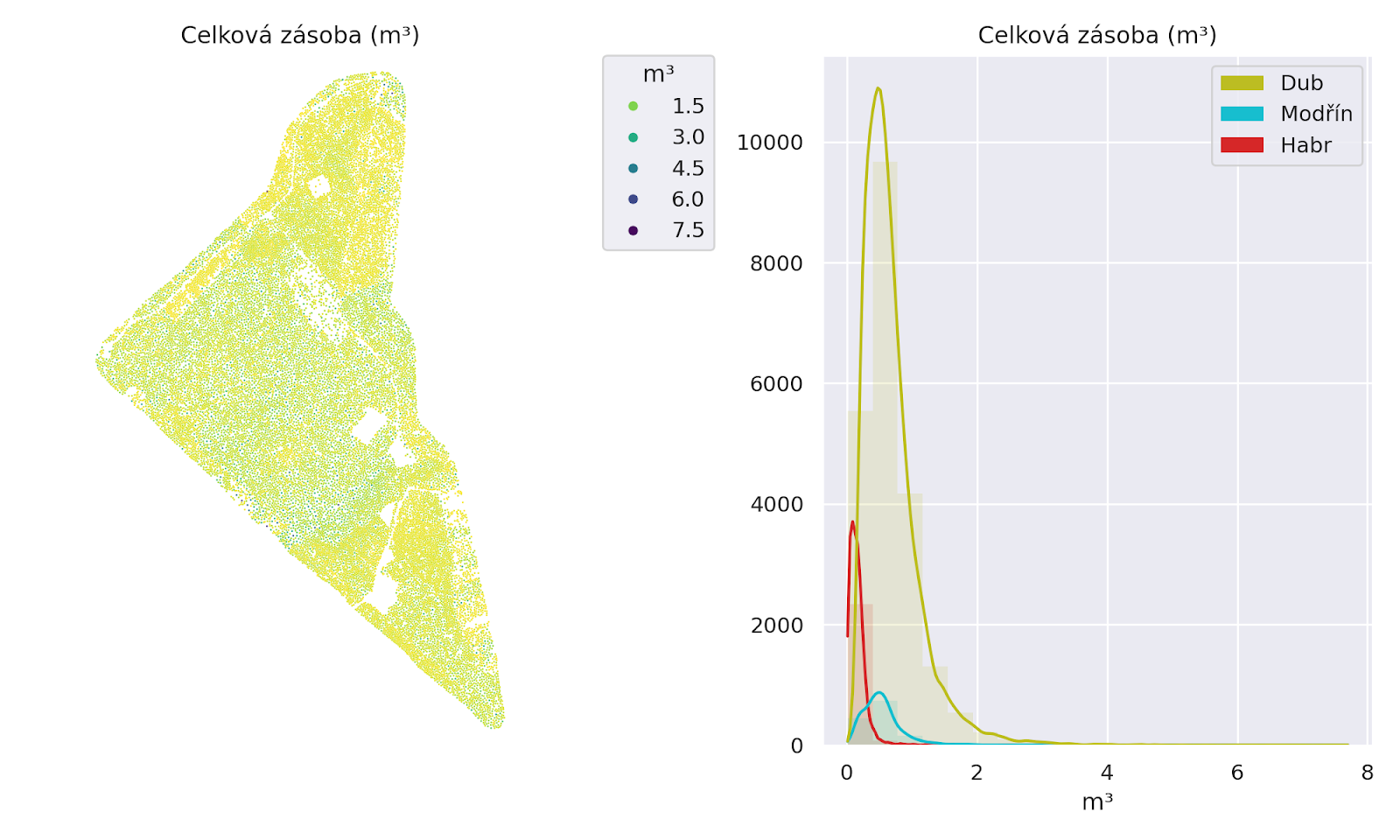 Vlevo: vizualizace objemu dřevní zásoby (v m³), legenda je škála začínající od 0. Vpravo: histogram rozložení dřevní zásoby podle jednotlivých dřevin – zobrazeny jsou tři nejpočetnější rody.