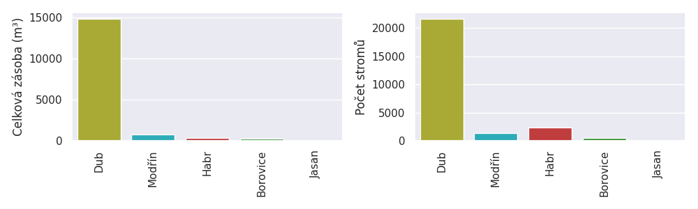 Přehled celkové dřevní zásoby a počtu stromů pro jednotlivé dřeviny.