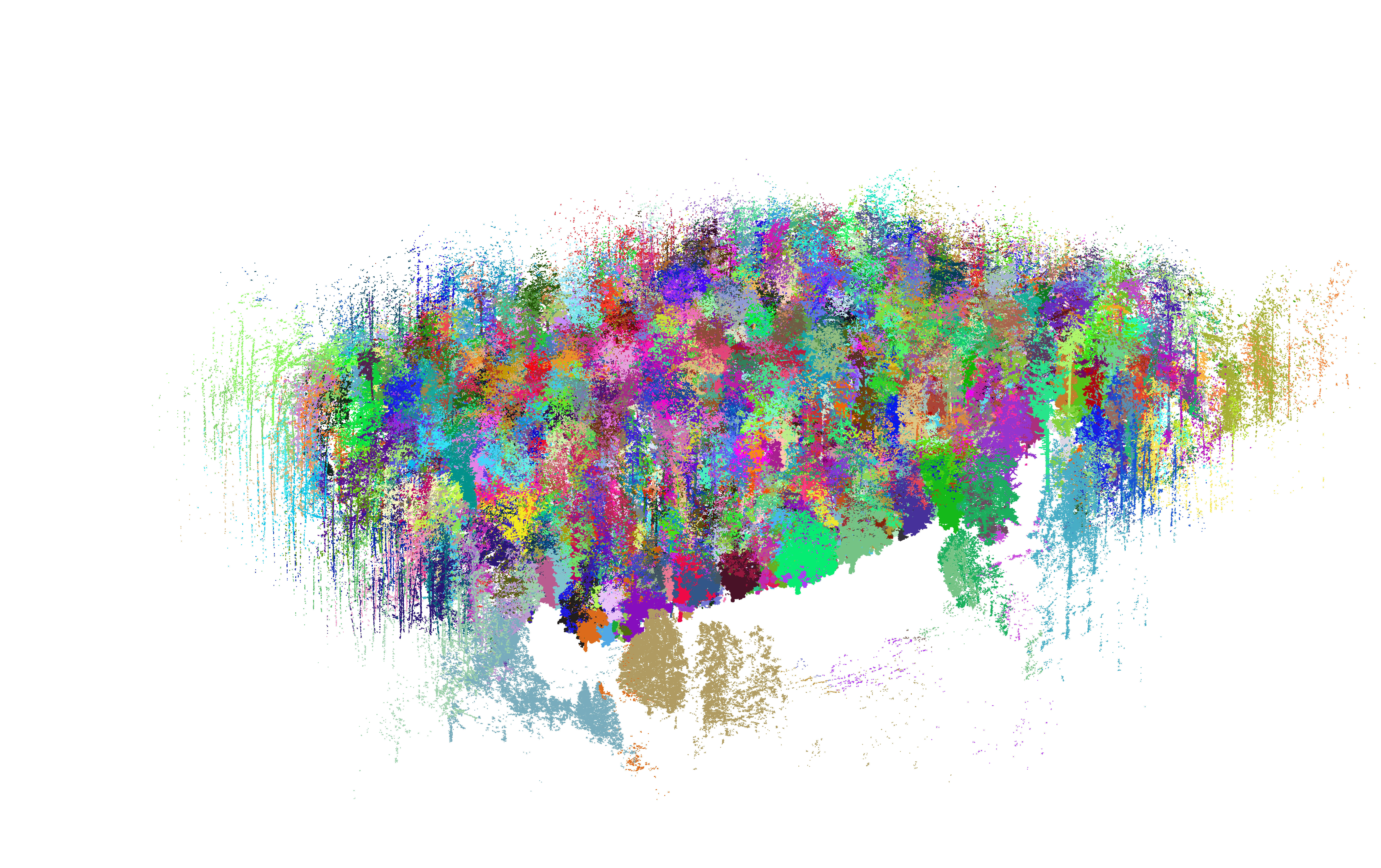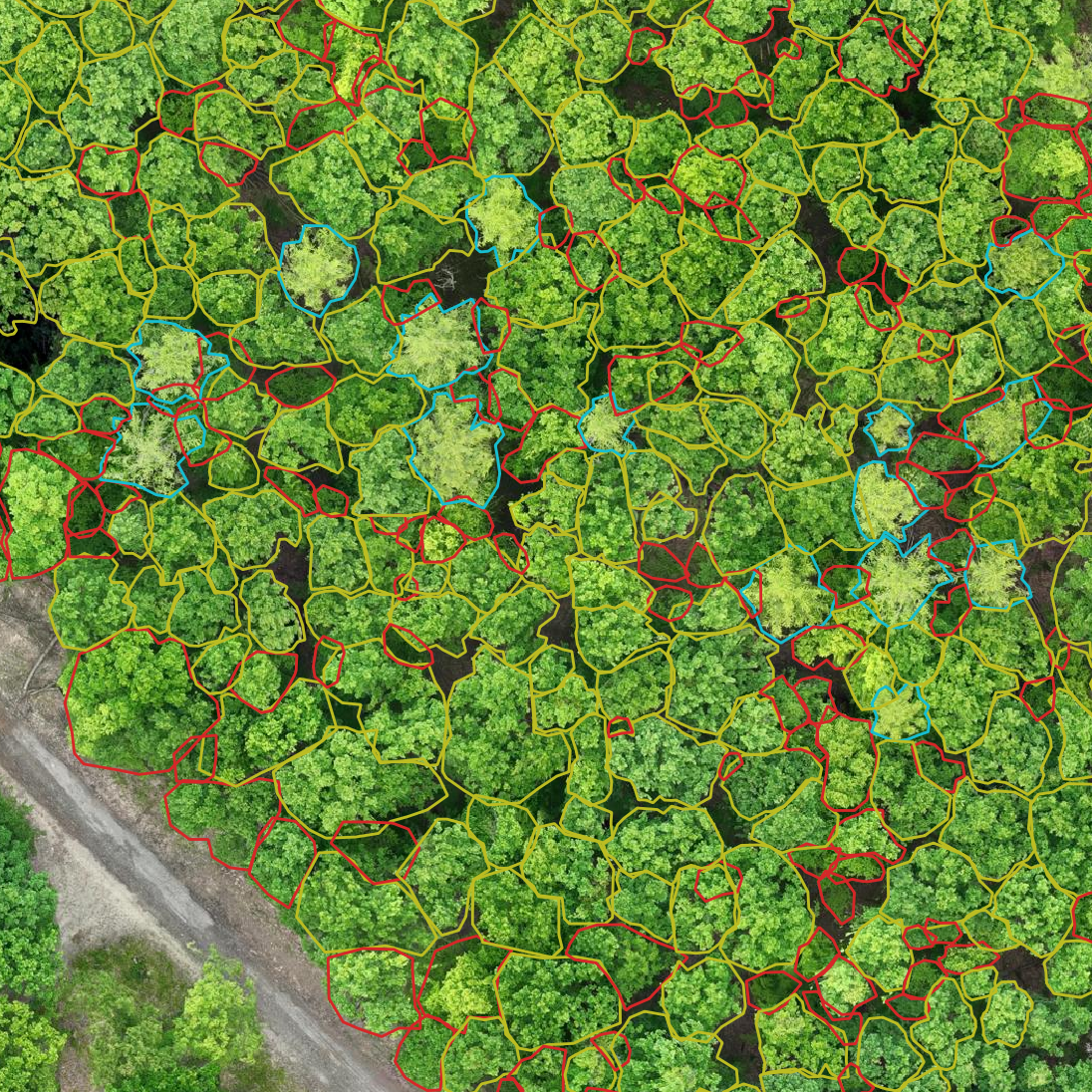 Segmentace jednotlivých korun a určení různých dřevin znázorněno pomocí barevných polygonů.